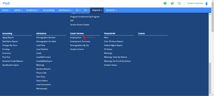 The Employment Report provides employment data for students with graduation dates in a specified time frame. You can filter this report to look at all students at the school or by program. This report will also give you the employment ratio for the group selected.