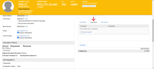 The Checklists Tab stores the list of required steps a lead must complete in order to enroll online.