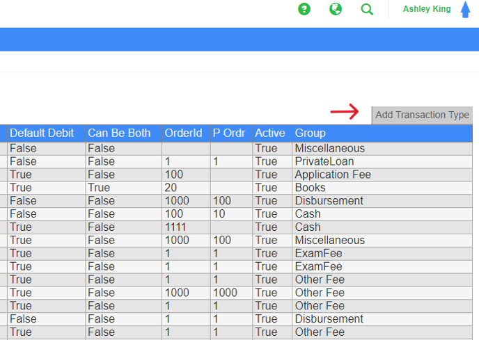 A list of your institution's Transaction Types will pull up. To add a new Transaction type click Add Transaction Type