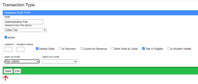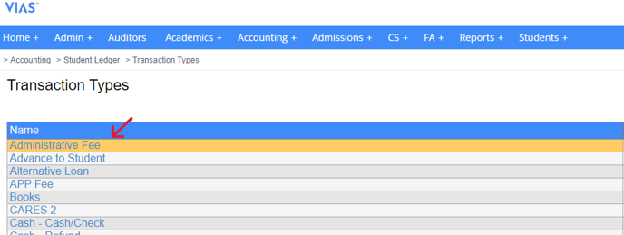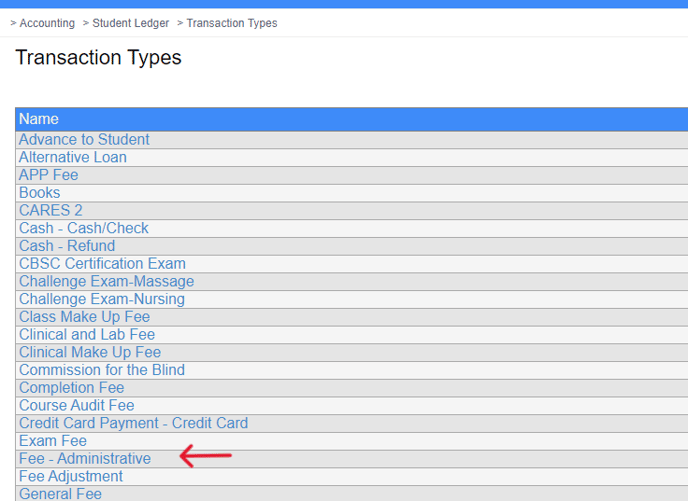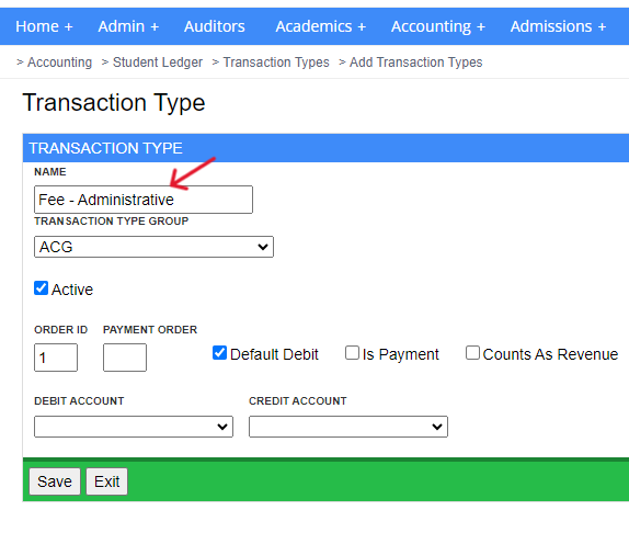 To create or modify a Transaction Type go to: Accounting > Student Ledger > Transaction Types
