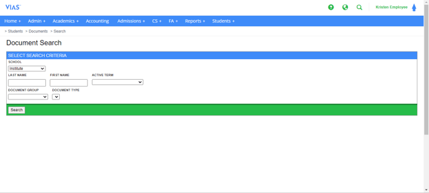 - Click Search. This will yield a result of all active students in the term selected that have that Document Type in their Student File. You can also view these documents on each Student’s Page.