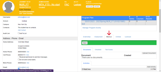 The Medical Tab includes all of the immunizations and drug screen results required for Admissions and/or clinicals and externships.