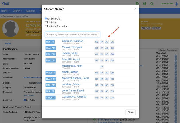 - Once located, you can click on the student's name and arrive at their VIAS profile.